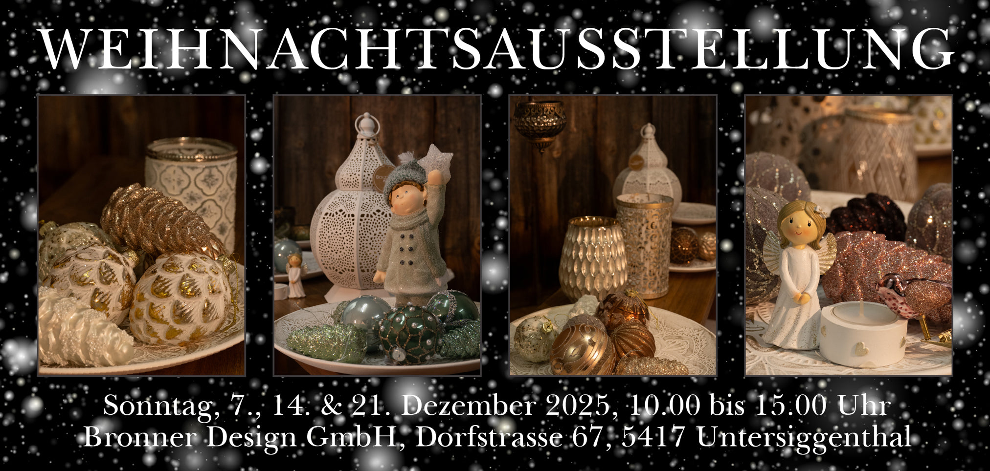 Entdecken Sie unsere festliche Weihnachtsausstellung und lassen Sie sich in vorweihnachtliche Stimmung versetzen. Bei Glühwein, Punsch und Weihnachtsgebäck können Sie in Ruhe stöbern und die besondere Atmosphäre geniessen.